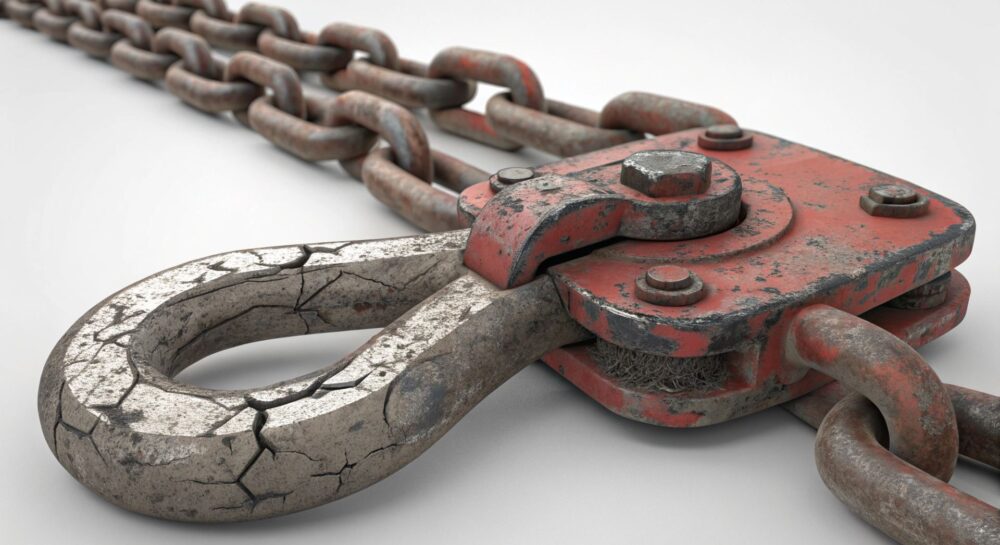 • Появление трещин на крюках: Как и на звеньях цепи, на крюках могут появиться трещины, что является критическим дефектом.