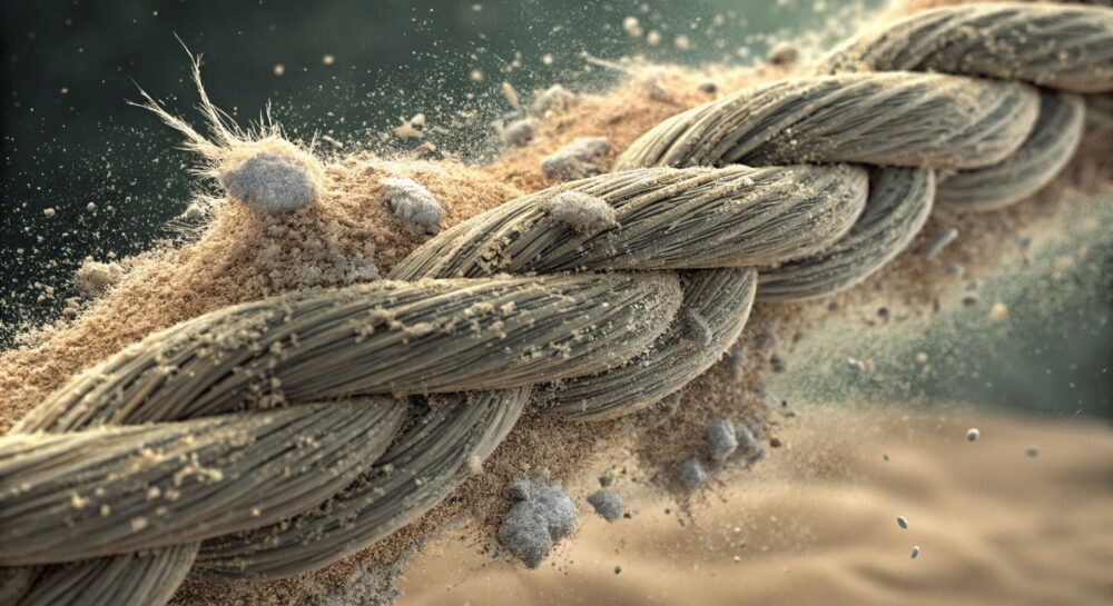Грязь и песок, будучи твердыми частицами, действуют как миниатюрные абразивы. Когда трос находится в движении, подвергается нагрузке или трению, эти частицы перемещаются между волокнами. Каждый такой контакт вызывает микроскопическое истирание поверхности волокна.