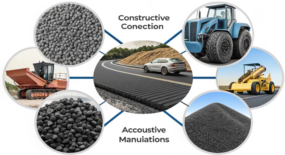 - Дорожное строительство: Вместо традиционного асфальта с добавлением мелкой резиновой крошки, крупнозернистые частицы используются для создания самоподдерживающихся оснований, которые снижают риск растрескивания и продлевают срок службы дорожного покрытия. Этот материал также часто применяется в асфальтобетоне с добавлением гранул резины, что улучшает шумопоглощение и снижает вибрации на дорогах.