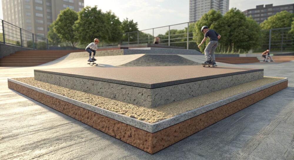 Важно: для скейт-инфраструктуры с высокой интенсивностью лучше использовать гравийную смесь с добавлением резиновой крошки, так как она улучшает дренажные системы и предотвращает скольжение на антискользящих материалах.