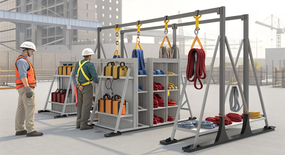 Более массивные конструкции, которые могут быть стационарными или мобильными (на колесах). Они часто имеют несколько ярусов или секций для раздельного хранения разных типов стропов.