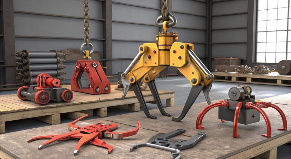- Описание: Специальные захваты, часто в виде «клещей» или петель с блокирующими элементами, разработанные для надежной фиксации труб или бревен.
