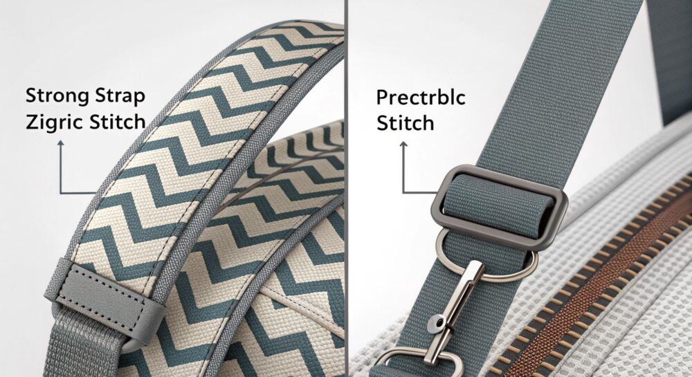 • Защита края: Зигзагообразная строчка эффективно обрабатывает края стропы, предотвращая их расплетание и истирание.